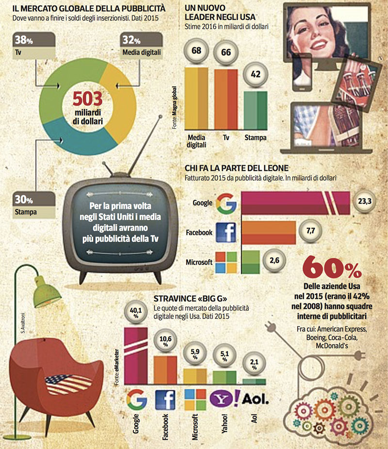 La pubblicità digitale, soprattutto i video guardati su apparecchi mobili, è il business più caldo del momento. Dei 503 miliardi di dollari spesi dagli inserzionisti l’anno scorso a livello globale, solo il 30% è andato sulla carta stampata, superata dai media digitali che hanno ricevuto il 32%.