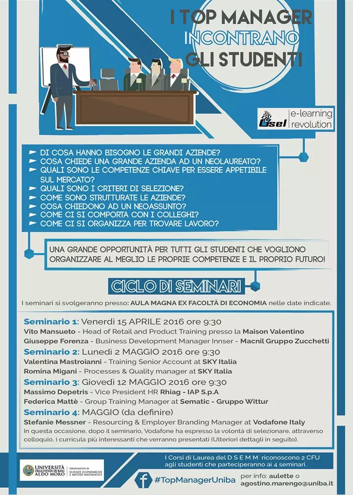 Venerdì 15 aprile presso l’Università Aldo Moro di Bari si apre il primo incontro del ciclo di seminari “I Top Manager incontrano gli studenti” organizzato da Osel, società leader nell’e-learning, e Univesità di Bari. Giuseppe Forenza, Business Development Manager della nostra azienda, è chiamato ad intervenire come docente all’apertura del seminario.