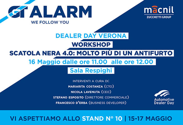E’ questo il titolo del workshop che apriremo a Verona in diretta dall’ Automotive Dealer Day il prossimo 16 maggio, ore 11:00 – 12:00. Vi aspettiamo allo stand 10 per conoscere tutti i vantaggi della speciale scatola nera GT ALARM per TUTTI: dalle case automobilistiche alle compagnie assicurative, dai rivenditori e installatori agli utenti finali.