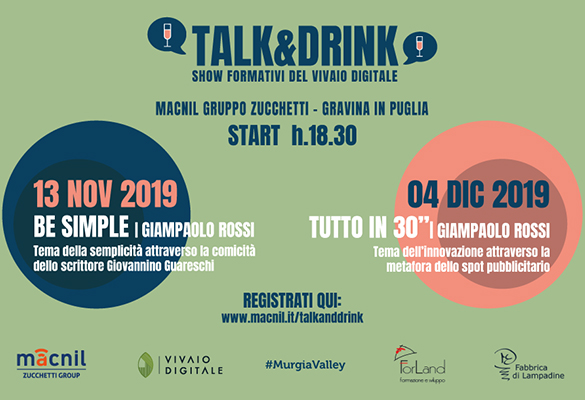 Il Vivaio Digitale, come scuola d’impresa e in collaborazione con Fabbrica di Lampadine e ForLand, dà vita a “Talk&Drink”, format leggeri e divertenti che affrontano temi manageriali e di leadership con contenuti formativi “spettacolari”.